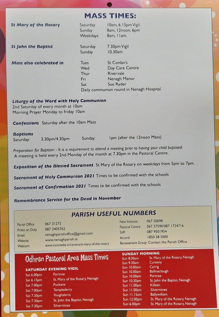 We remind parishioners that you can obtain a paper copy of the Newsletter at weekends inside both Nenagh Parish churches. Downloadable copies are available here on the website or by joining the mailing list at nenaghpastoralcouncil@gmail.com