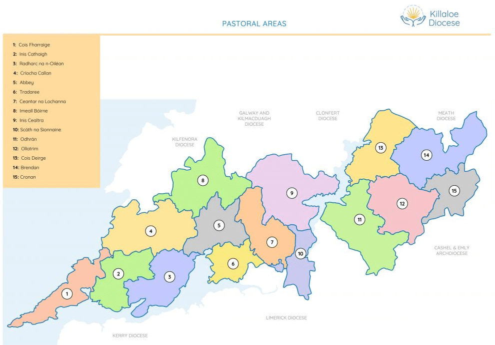The 58 parishes of the Diocese of Killaloe are divided into 15 Pastoral Areas, stretching in an easterly direction from Loop Head Peninsula to the heart of the Irish midlands.